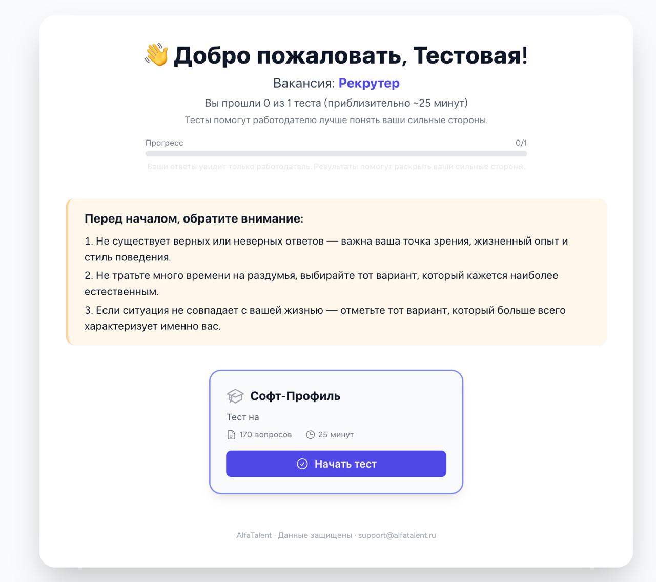 Кандидат получает ссылку на тест